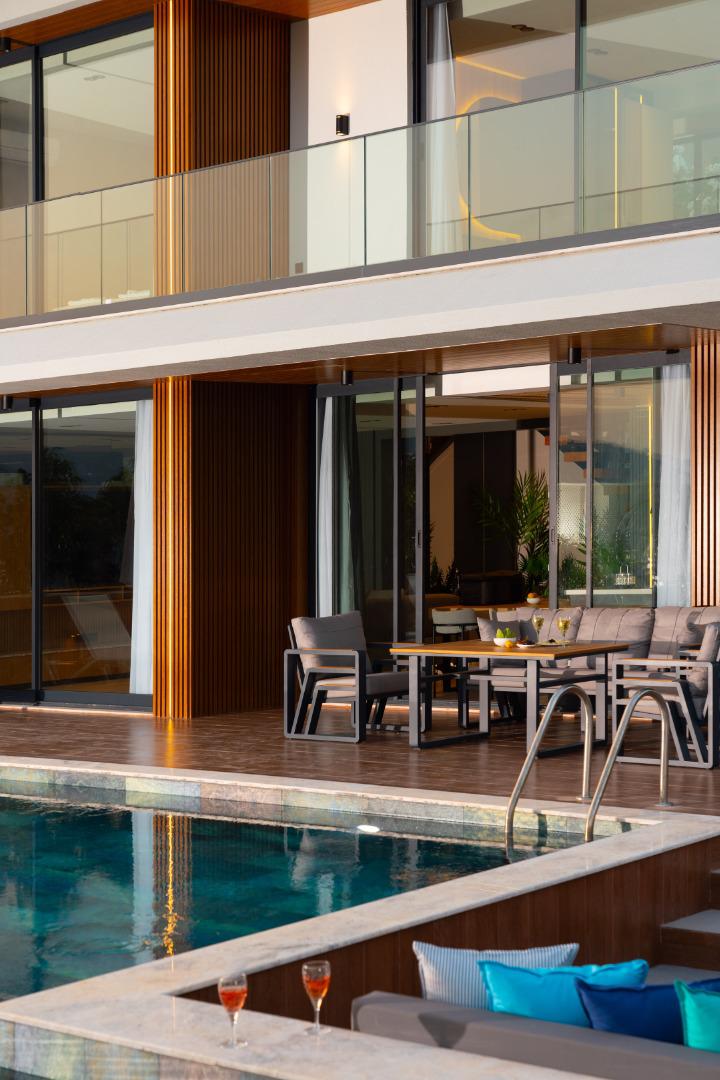 Villa Aura A, 6 kişilik konaklama kapasitesiyle, deniz manzaralı ve lüks bir tatil deneyimi sunar. Geniş yeşil bahçesi, bahçede oturma alanı ve modern tasarımıyla konfor ve estetiği bir araya getirir.