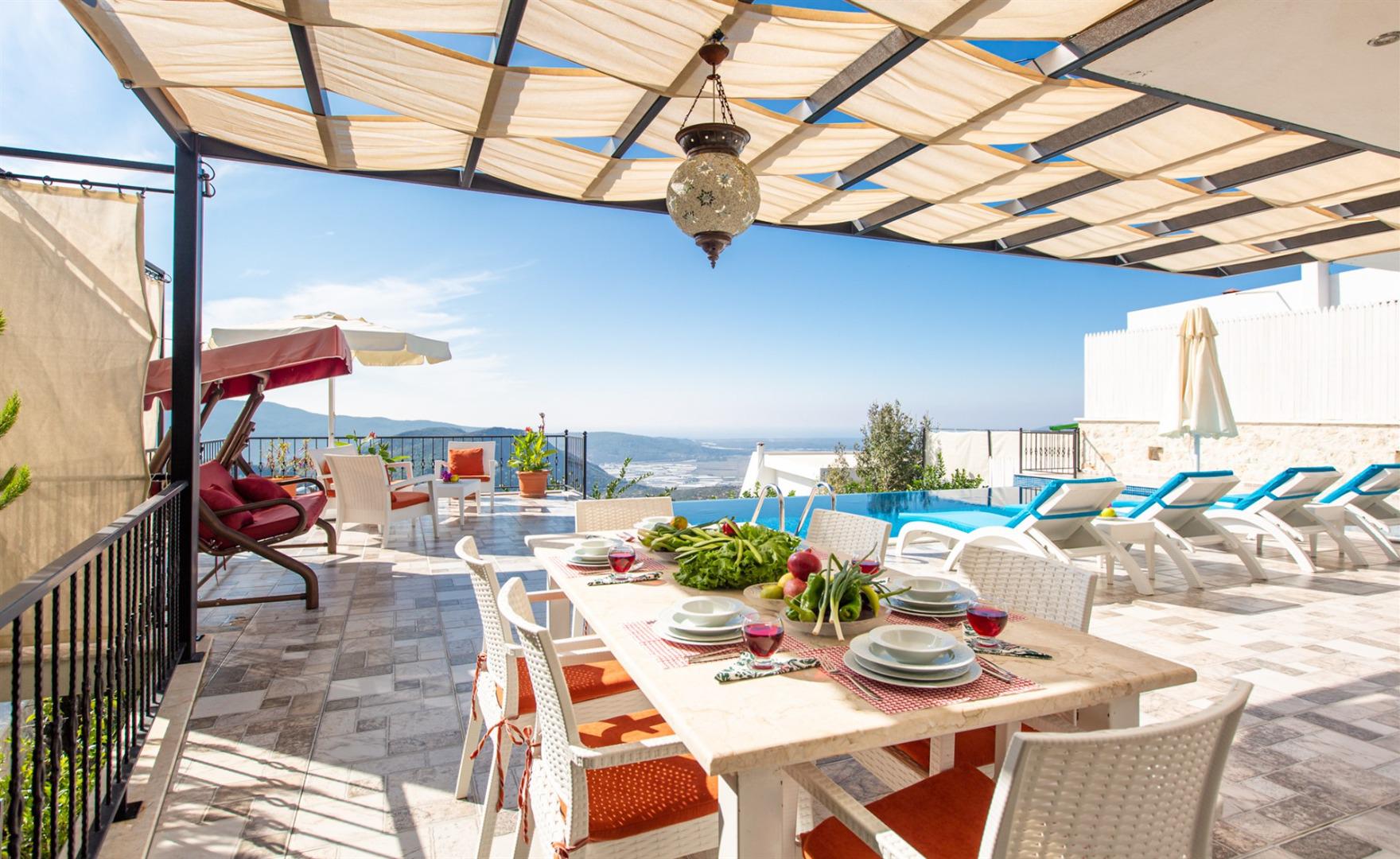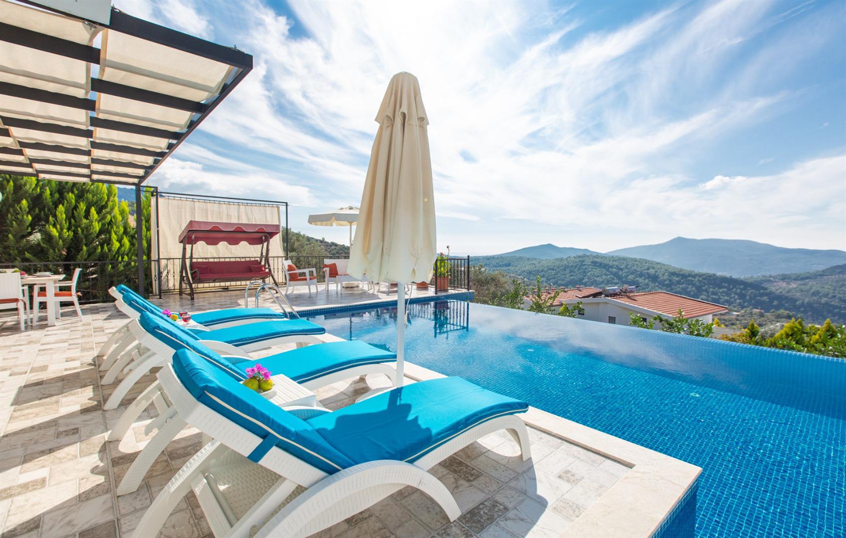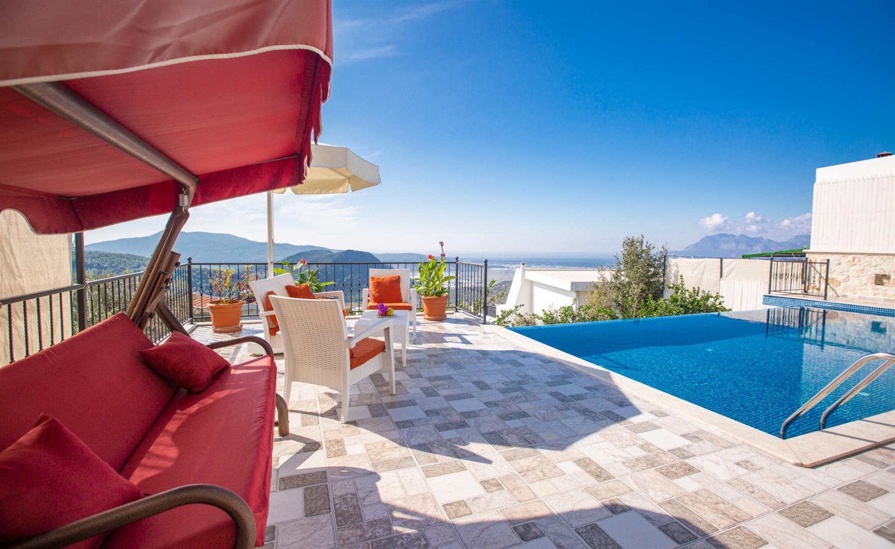 Villa Eslem, 5 kişilik konaklama kapasitesiyle, dağ ve panoramik Patara denizi manzarasının tadını çıkarabileceğiniz eşsiz bir tatil villasıdır. Isıtmalı havuzu, jakuzisi ve korunaklı havuz tasarımıyla hem konfor hem de mahremiyet sunar.