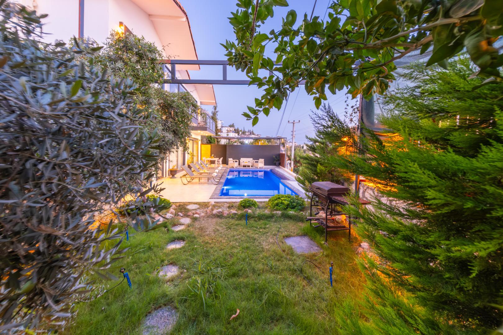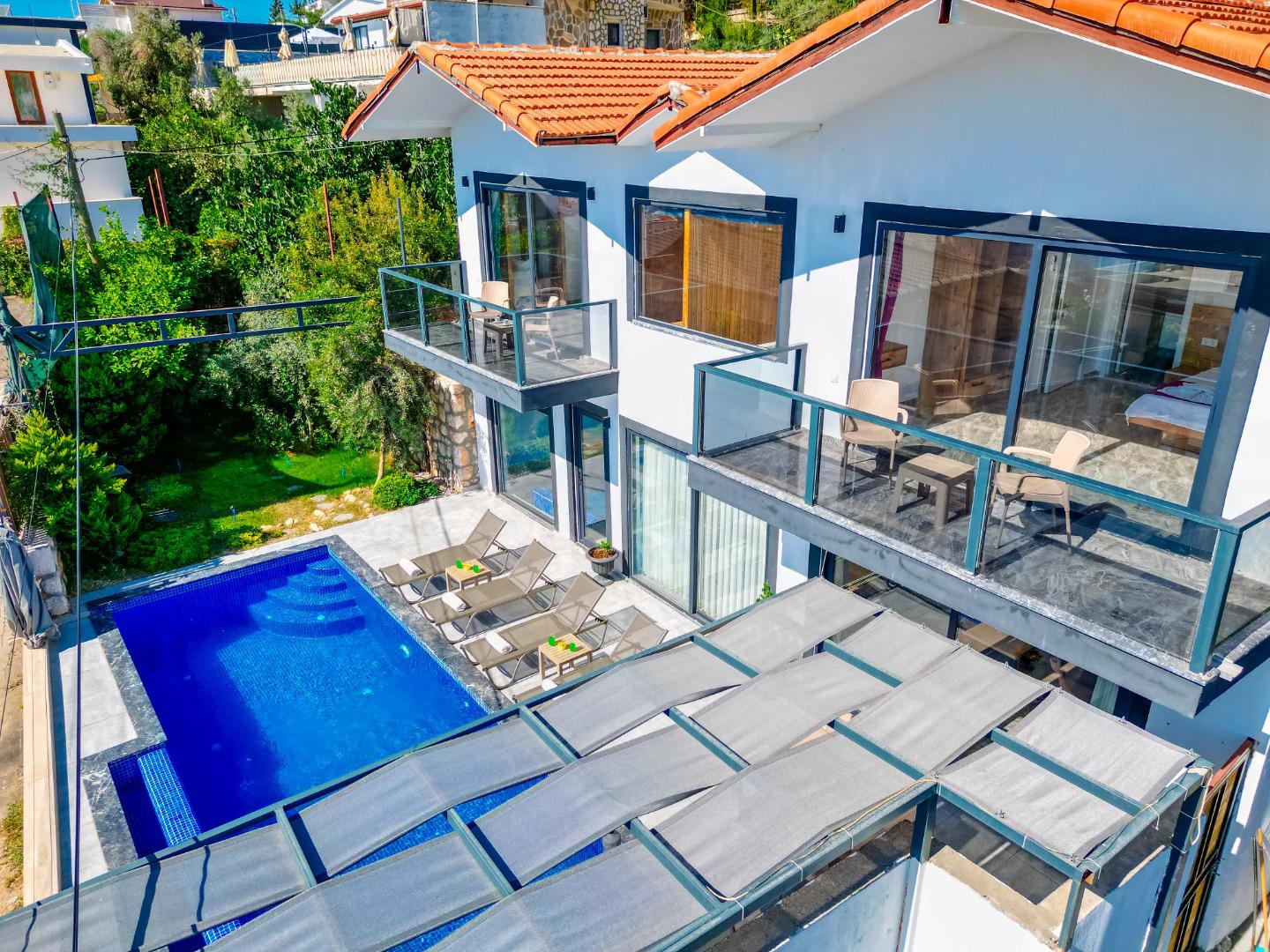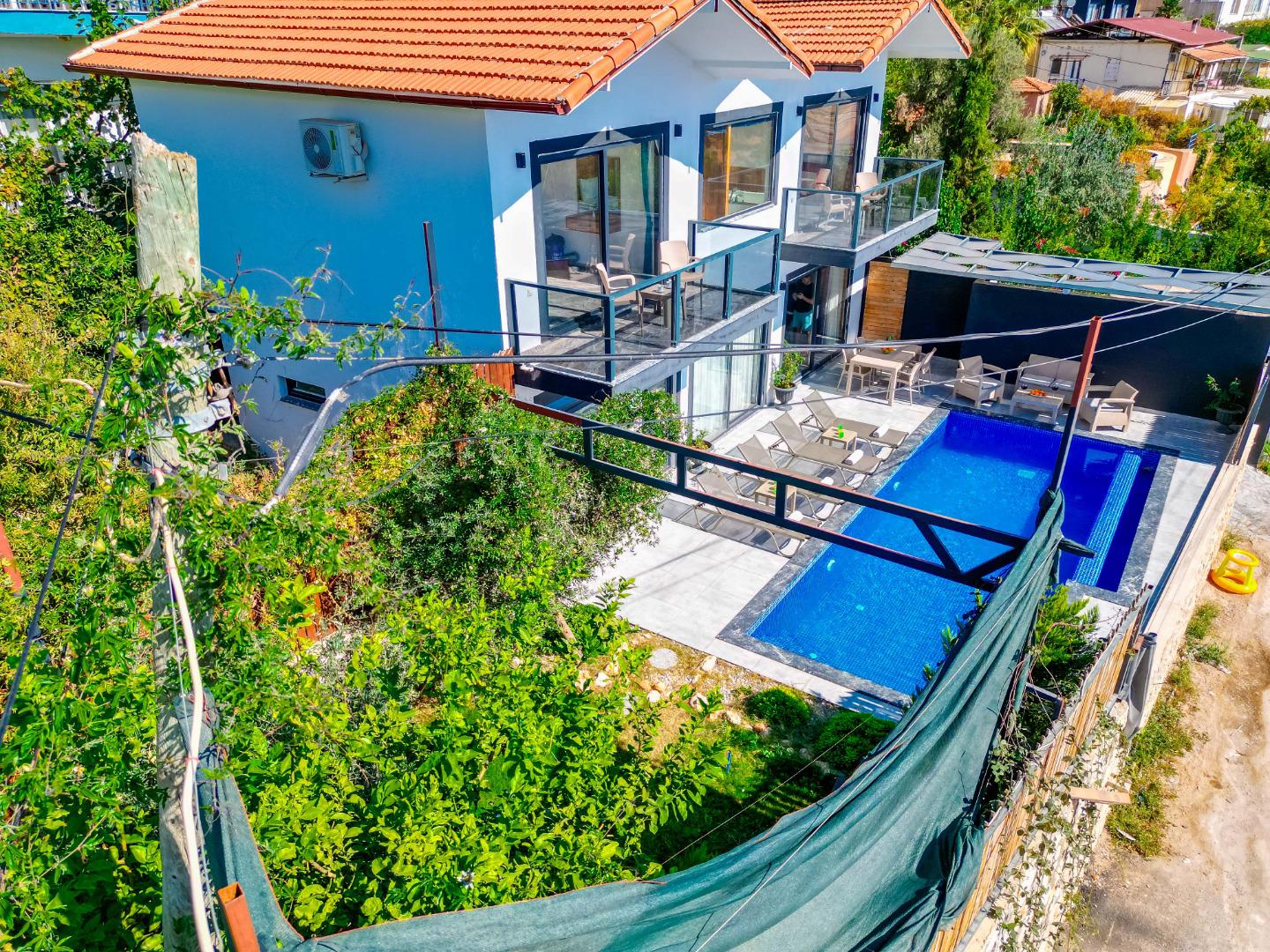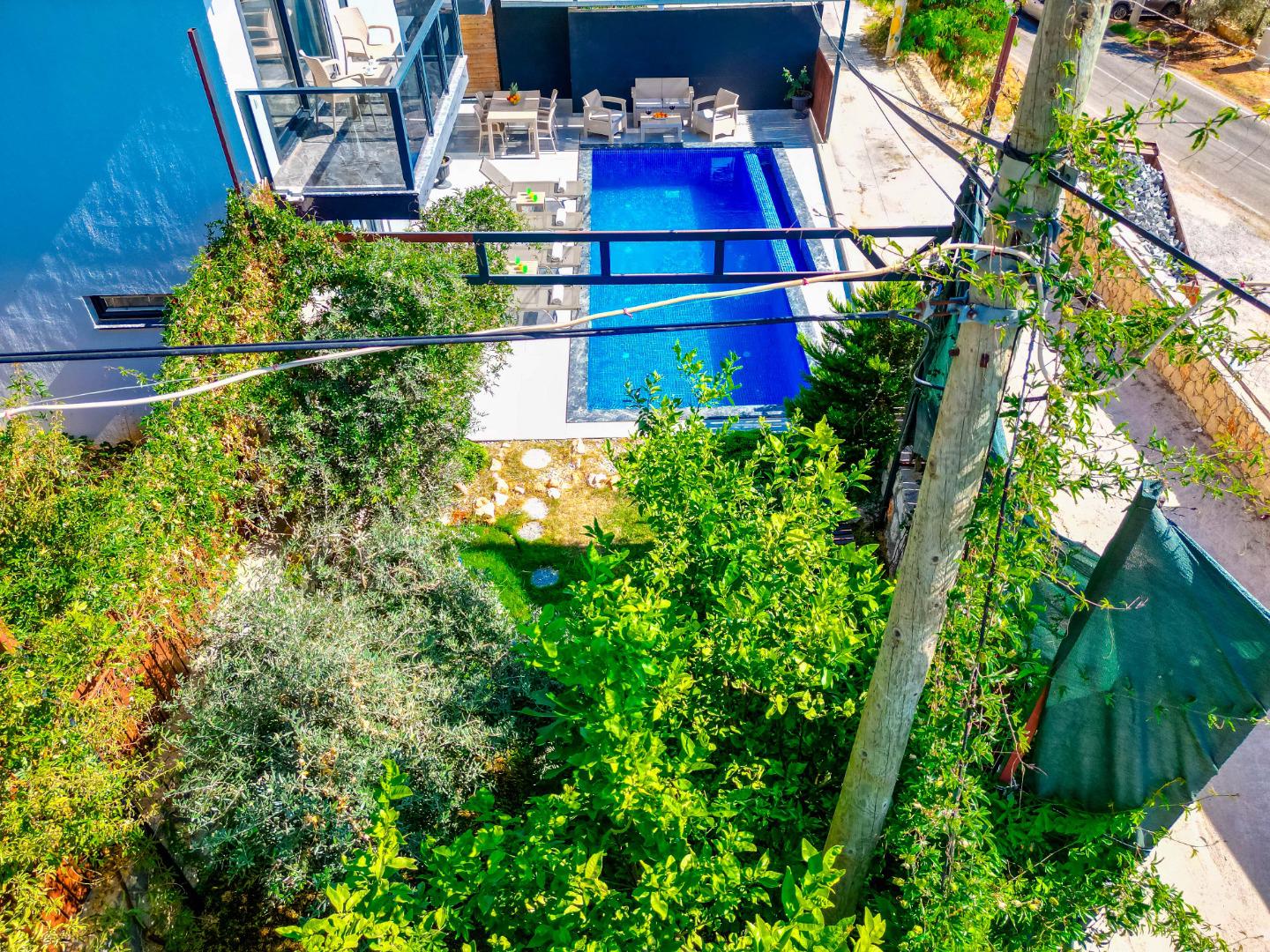 Korunaklı Yapı: Havuz ve bahçe alanı dışarıdan görünmeye karşı korunaklıdır, gözlerden uzak tatil imkânı sunar.