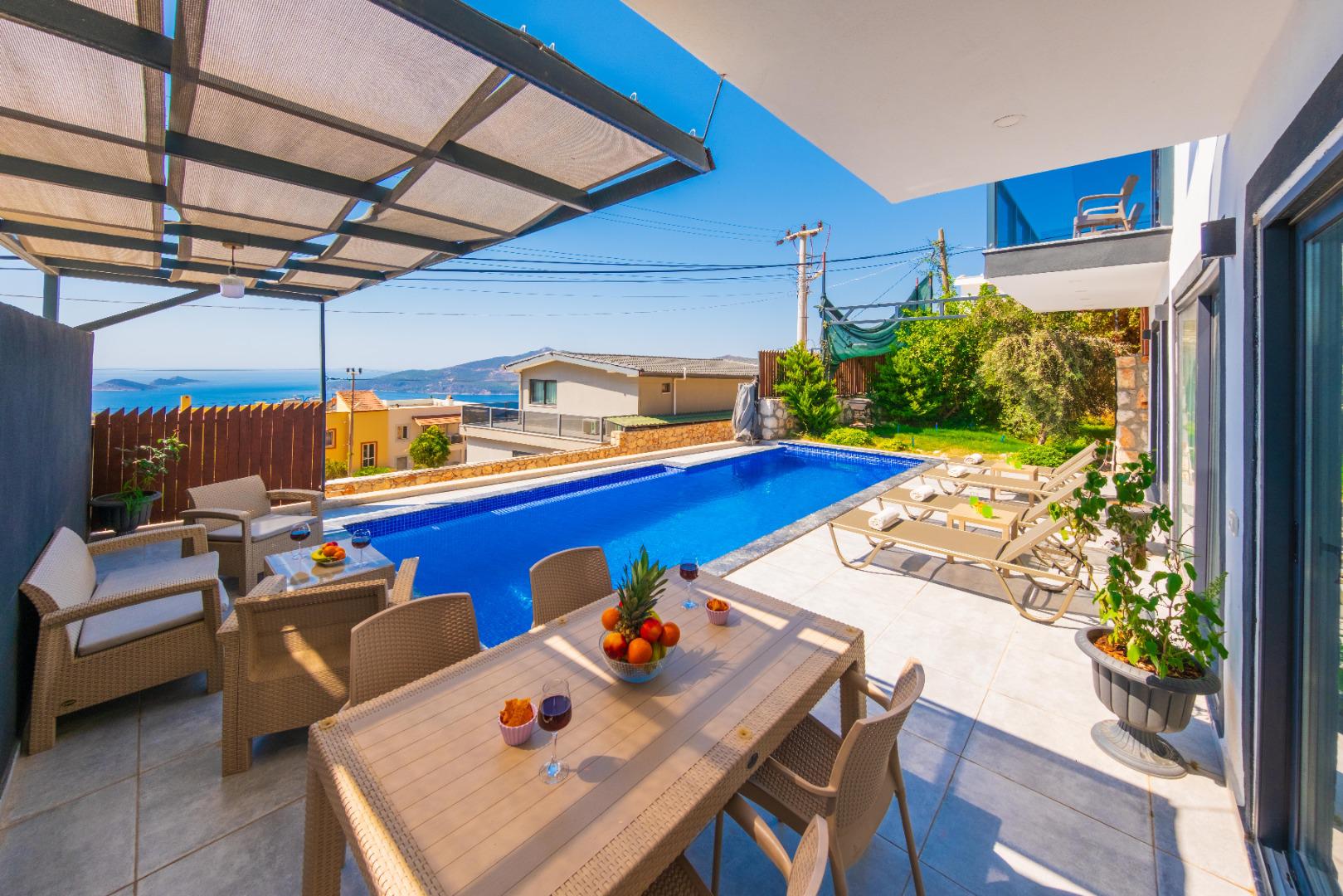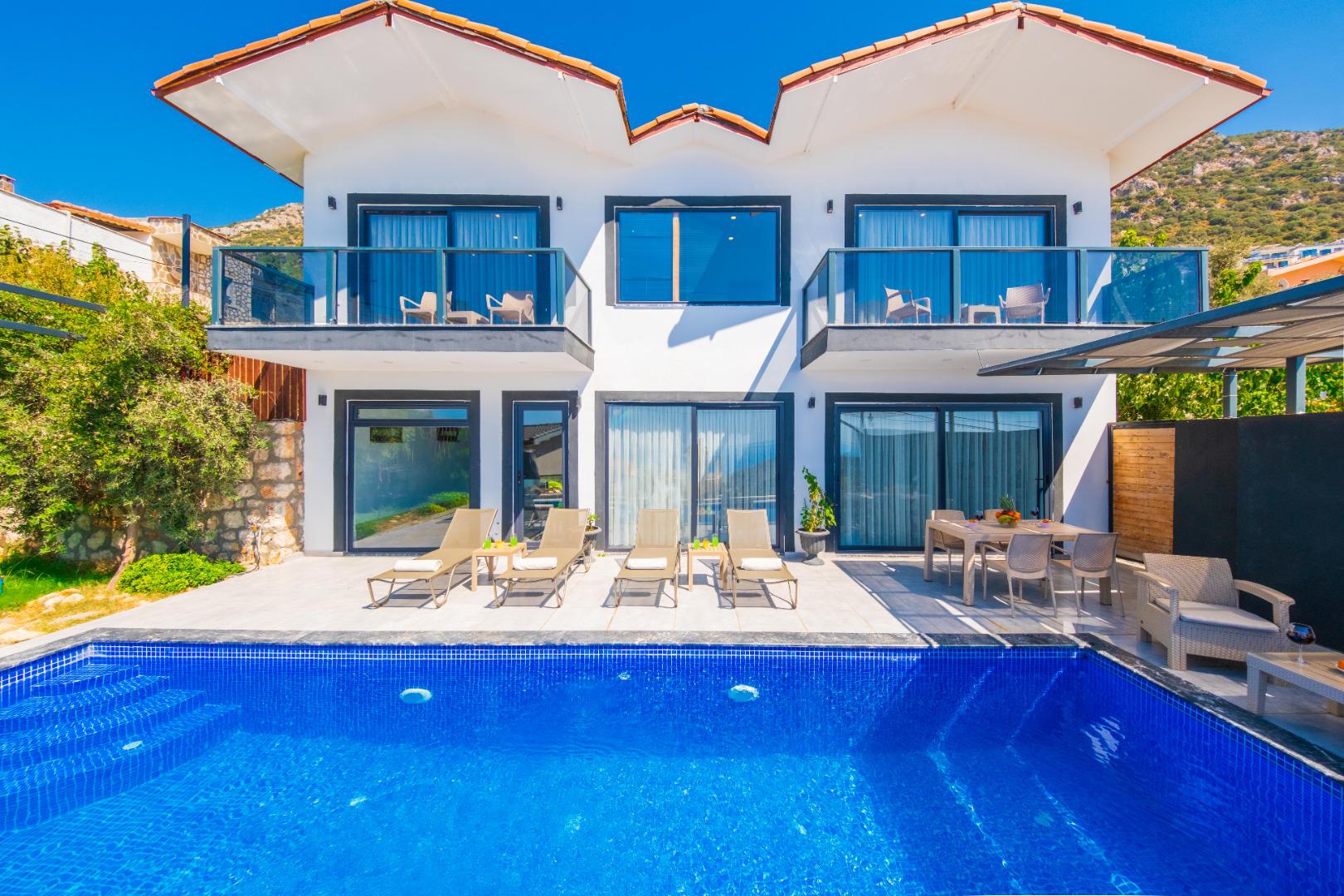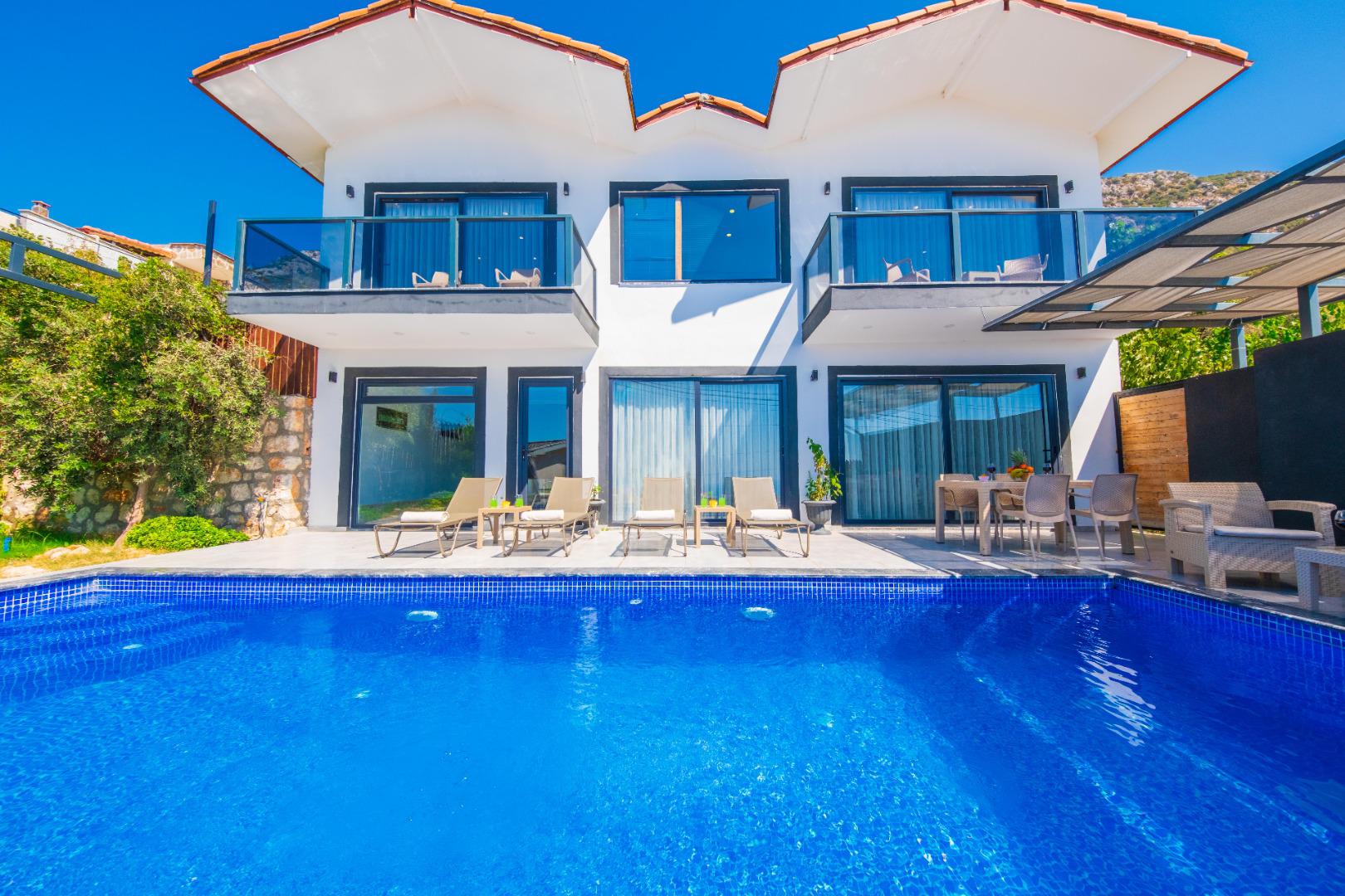 Korunaklı Yapı: Havuz ve bahçe alanı dışarıdan görünmeye karşı korunaklıdır, gözlerden uzak tatil imkânı sunar.